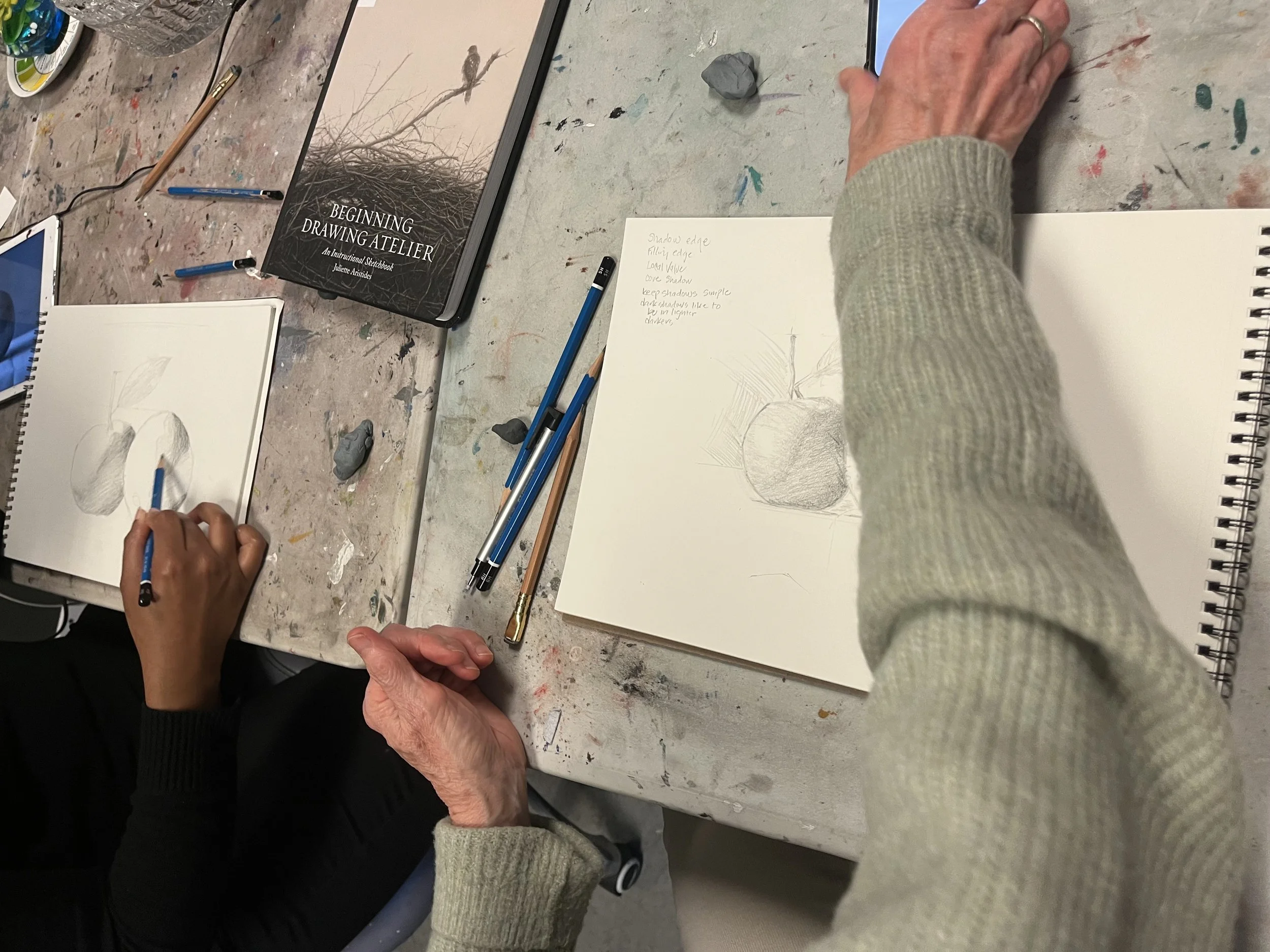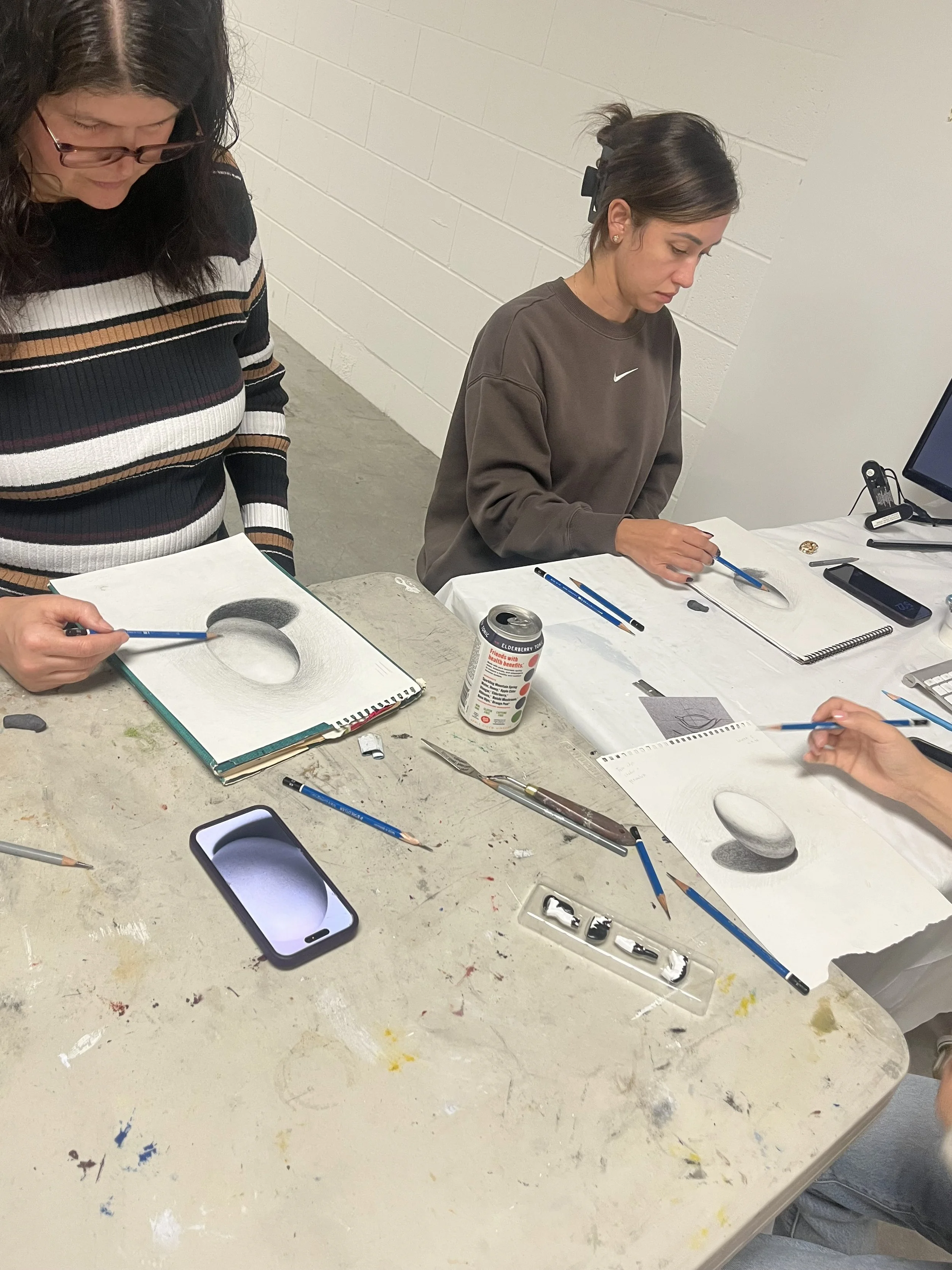 Intro to drawing basics including types of pencils and other materials, and getting used to our daily warm ups and exercises such as ellipses
